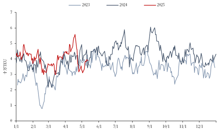 从数据层面可以对此有更直观的认识:(1)需求端,目前5月的数据尚未完全公布,但可从中韩两国出口的高频数据进行感知。5月前10天,韩国向欧盟出口金额同比减少38.11%,向美国出口金额同比减少30.41%;中国重点港口集装箱吞吐量5月第一周环比4月周均减少1.86%(图1)。(2)供给端,船司运力部署情况为:5月远东至北欧的运力为318988 TEU,环比增长3.4%;对于美西线,4-6月撤出5条航线,4月空班数为28,同比增长40%,运力同比减少1.5%;5月空班数为41,同比增长68%,运力同比减少9.8%。且根据高频数据(图2),4月18日中国至美国的运力达到了55.8万TEU,而后迅速下跌,5月2日仅有31.0万TEU,降幅高达44.4%。