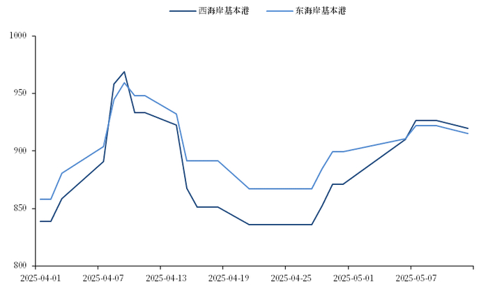 首先,从图2可知,进入5月第二周后至今,中国至美国的运力出现了触底反弹:由31.0万TEU回升至39.0万TEU,涨幅25.8%。原因在于,4月24日,面对较低的库存水平,Walmart、Target和Home Depot这些美国零售业巨头与特朗普进行了见面讨论贸易问题,4天后即4月28日,Walmart便宣布其恢复了对中国的进口。相应地,从图3可知,4月28日后,美线即期运费开始上涨:天津至美西航线在上周升至 $2550/FEU,环比4月底增长了10.5%。不仅如此,从船司的角度来看,尽管货量崖式下滑,美线运力的撤出对装载率产生了支撑,且面对旺季,船司依然采取了宣涨的动作:即美西线自5月15日起FAK费率上涨 $1000-$2000/FEU,此举可将美西线运费推升至$3500/FEU以上。——基于此,对于欧线来讲,随着预期与现实逐步进入正反馈循环——运力压力的减轻和货量需求的回升提振装载率的现实修复强化已经转强的预期,船司同样可能将走出美对等关税带来的囚徒困境进入集体宣涨的合谋之中。