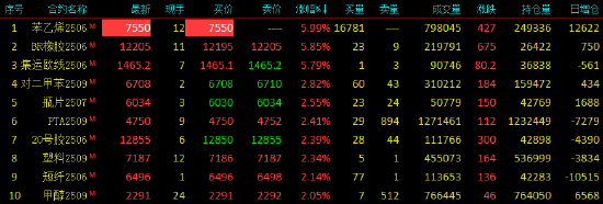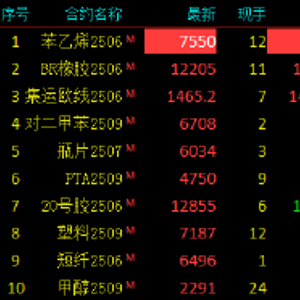 2025年5月13日,国内期货主力合约互有涨跌。苯乙烯(EB)封涨停板,涨幅5.99%;集运欧线、丁二烯橡胶涨超5%,PX、瓶片、PTA、20号胶(NR)、塑料、短纤、甲醇涨超2%。跌幅方面,玻璃、菜粕跌近2%。
