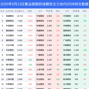 新浪期货 根据交易所数据,截至5月13日收盘主力合约集运指数欧线期货2508,涨跌+12.38%,成交量6.61万手,持仓数据显示前20席位呈现净空,差额头寸为268手。