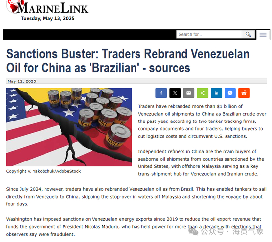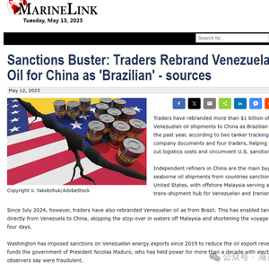 根据航运网站MarineLink报道,近年来,在国际能源市场的灰色地带,一场精心策划的 “石油变脸” 大戏正在上演。根据两家油轮追踪公司、企业文件及四名贸易商的信息显示,过去一年间,超过 10 亿美元的委内瑞拉石油被重新包装为巴西原油运往中国。这一堪称 “神操作” 的贸易手法,不仅帮助中国买家大幅降低物流成本,更巧妙地绕过了美国制裁与进口配额限制,在国际能源贸易格局中掀起了不小的波澜。