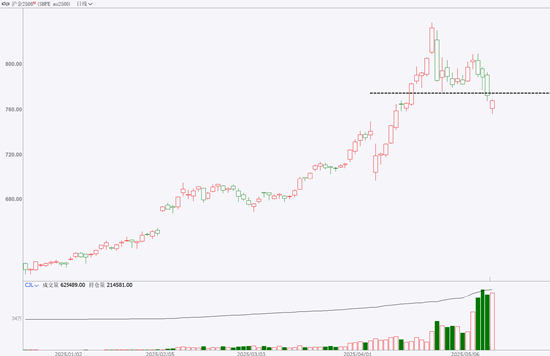 接下来再把目光聚焦到内盘沪金身上。沪金2508合约已经向下突破了位于770一带的支撑区间,但考虑到内外盘面的联动关系,以及沪金在向下突破之后又很快收出放量阳线,因此建议交易者短期不要贸然追空,在充分观察外盘走势,以及沪金能否企稳在770以下之后再进行决策,是相对更加稳妥的选择。
