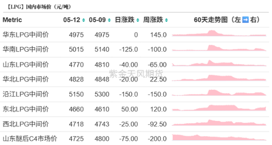 近期多地气温较4月回升明显,燃烧需求处季节性淡季,国内主要地区民用气现货价多有小幅回落。