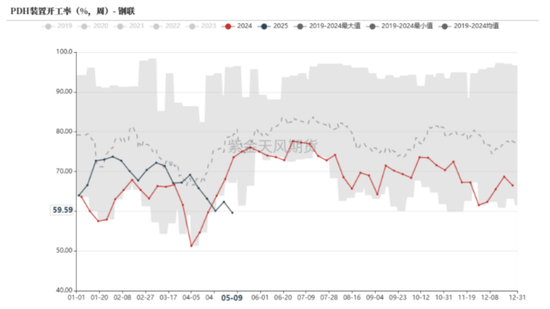 化工需求方面,近期化工需求走弱明显,截至5月9日,PDH装置开工率为59.59%,环比前一周回落2.76个百分点,PDH装置开工率创历年同期低位,山东醚后C4市场价也已经处于历年同期偏低水平。根据当期PDH装置检修情况预计到6月下旬PDH装置开工率方能有明显改善。