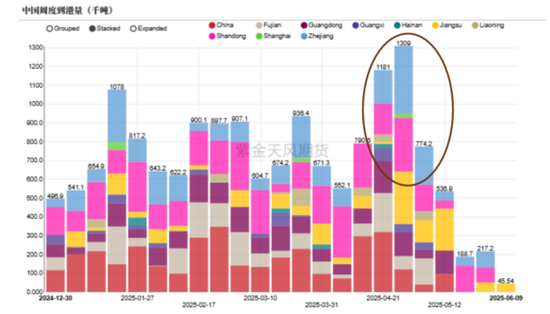 根据咨询商统计数据,未来三周预计总到港量较前三周有明显回落,国内进口商在5月中旬后或多以消化库存为主,港口库存有回落可能。