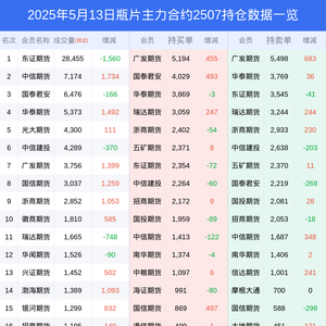 新浪期货 根据交易所数据,截至5月13日收盘主力合约瓶片2507,涨跌+2.55%,成交量5.08万手,持仓数据显示前20席位呈现净空,差额头寸为315手。