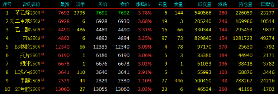 2025年5月14日,早盘开盘,国内期货主力合约多数上涨。苯乙烯(EB)、PX、乙二醇(EG)、PTA、丁二烯橡胶、瓶片、短纤涨超3%,低硫燃料油(LU)涨近3%,甲醇、20号胶(NR)涨超2%。跌幅方面,尿素、烧碱跌超1%。