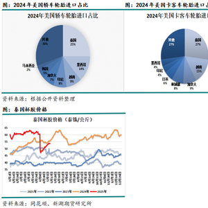 2.尽管轮胎并不适用对等关税,但由于害怕美国关税政策变化,因此在美国给予的90天缓冲期内,东南亚存在轮胎抢出口现象。由于美国的轮胎进口依存度很高,达到75%以上,因此其进口轮胎数量很大但进口天然橡胶数量并不大。2024年,美国进口天然橡胶数量大约为89万吨。东南亚天胶主产国泰国、越南、印尼、马来西亚和柬埔寨等是都美国进口轮胎重要的来源国。尤其是泰国和越南是2024年美国轮胎第一大和第三大来源国。