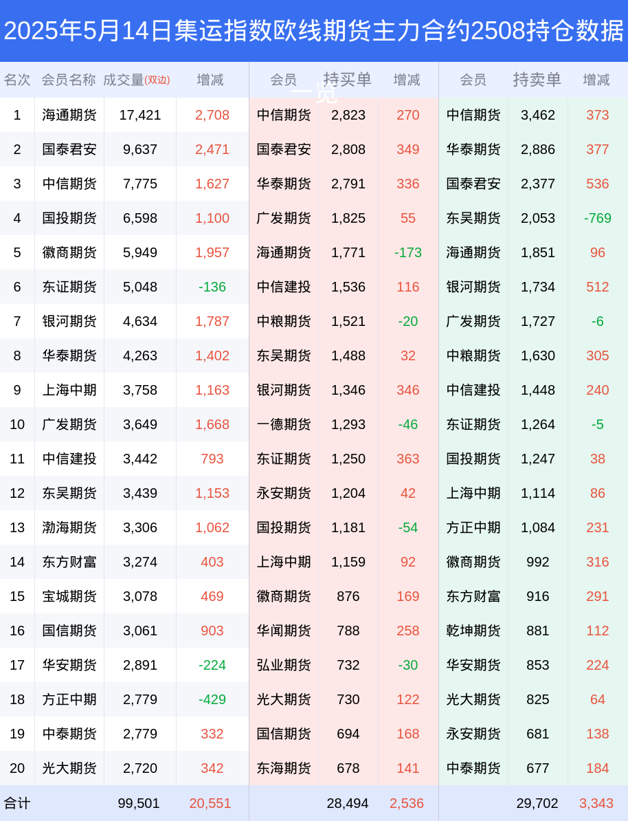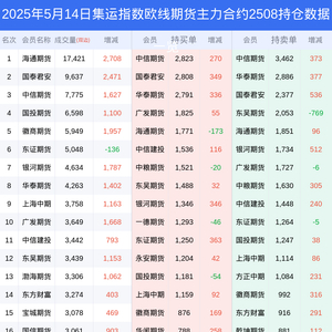 新浪期货 根据交易所数据,截至5月14日收盘主力合约集运指数欧线期货2508,涨跌+16.00%,成交量8.38万手,持仓数据显示前20席位呈现净空,差额头寸为1208手。