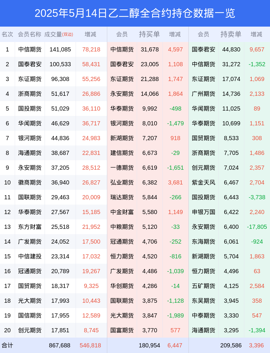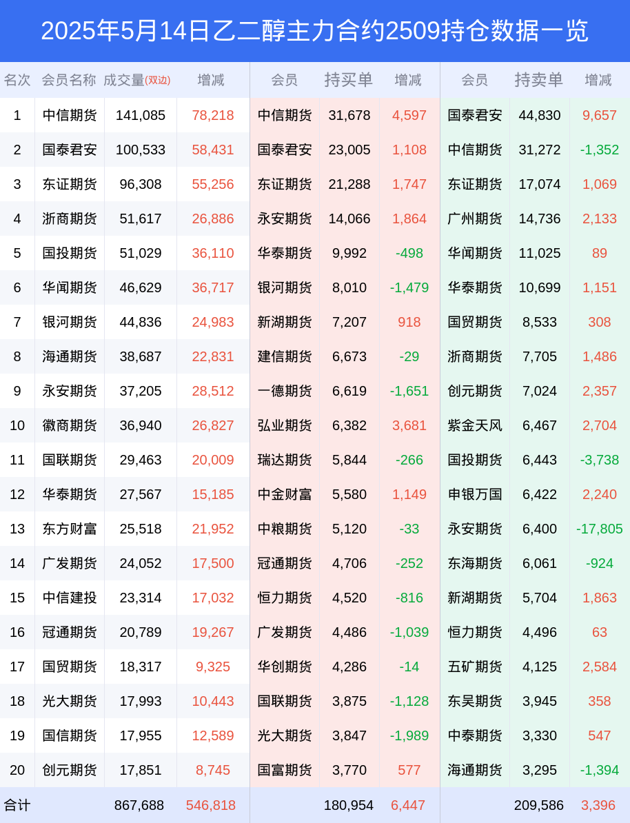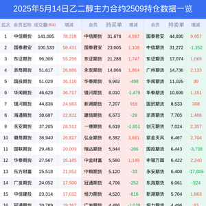 新浪期货 根据交易所数据,截至5月14日收盘主力合约乙二醇2509,涨跌+3.68%,成交量68.64万手,持仓数据显示前20席位呈现净空,差额头寸为28632手。