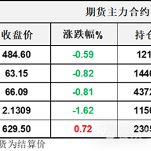 【1】WTI主力原油期货收跌0.52美元,跌幅0.82%,报63.15美元/桶;布伦特主力原油期货收跌0.54美元,跌幅0.81%,报66.09美元/桶;INE原油期货收跌0.59%,报484.6元。