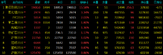 2025年5月15日,早盘开盘,国内期货主力合约涨跌不一。集运欧线涨超15%,氧化铝涨超3%,聚氯乙烯(PVC)涨超2%。跌幅方面,沪金、SC原油、沪银、液化石油气(LPG)、燃料油跌超1%。