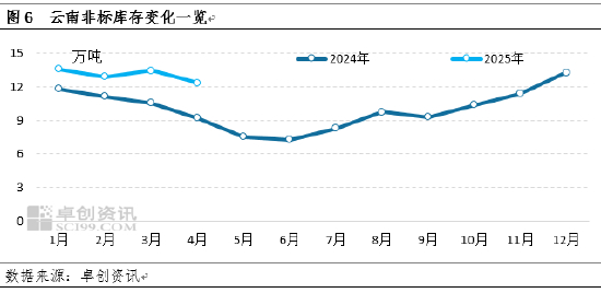 2025年1-4月份云南地区天然橡胶非标库存同比走高,主要是因为一季度受0关税政策影响部分自老挝缅甸胶进口增长明显,导致昆明+版纳库存同比增长。4月份开始伴随上游橡胶加工厂陆续开工,仓库出库情况有所好转,库存开始去化。但今年产区物候条件较去年好,伴随国产胶上量以及进口胶补充,导致5月份整个云南地区库存去化节奏缓慢。截至4月底,卓创资讯统计样本内云南地区非标库存12.35万吨,环比下滑7.97%,同比增长34.09%。