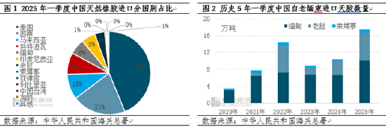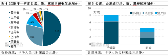 2025年一季度,云南省累计进口8.11万吨,占比46%,其中自老挝进口4.6万吨,绝大部分以标准胶为主;自缅甸进口3.56万吨,主要以标准胶、烟片胶为主。近些年老挝当地建厂橡胶加工厂增多,依托当地原料加工成标准胶、混合胶出口至云南市场流通。