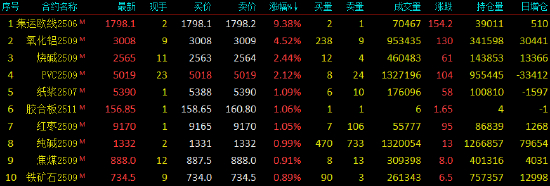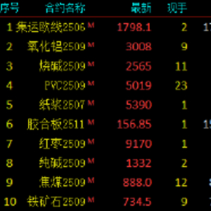 2025年5月15日,早盘收盘,国内期货主力合约涨跌不一。集运欧线涨超9%,氧化铝涨超4%,烧碱、聚氯乙烯(PVC)涨超2%。跌幅方面,SC原油、沪金跌超3%,沪银跌超2%,液化石油气(LPG)跌近2%。