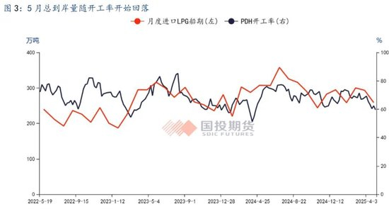 船期数据显示国内5月13日关税生效前,大量美国丙烷集中到岸,使得5月上半月国内到岸量仍维持高位,码头库容率开始上行,但下旬到岸量预期迅速减少,使得5月总到岸量预计环比下降11.8%至258万吨。另一方面,由于预期此后进口货源缩紧,隆众数据显示PDH周开工率在5月8日下降至59.6%,在关税调整前市场预期开工率或进一步下降至55%左右,接近至一年来最低位。目前已停工项目中约有370万吨产能为4月初以来停工项目,占国内产能的15%左右,这部分停工产能或主要受美国关税影响为主,后续若国内到岸成本如期回落,有望较快复工。
