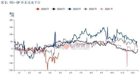 因此总体来看,短期区域价差有望收缩至4月初加征关税前的水平,而国内市场由于炼厂检修季结束外放增加和5月上半月抢进口,供给阶段性过剩压制炼厂气价格持续下调,现货端承压加剧。后续新停工PDH项目或有望在1-2个月内陆续恢复,使得开工率再度回到65%左右,但我们已认为后续海外增供压力仍将释放,这一复产或需建立在价格下行修复毛利的基础上。若终端丙烯需求偏弱或进口成本回落幅度有限导致复工偏慢,叠加6月后海外供给增量的释放,当前对原油偏高的价格或加速回落至历史区间内,最终推动持续高位运行的国内价格下行破位。盘面年初以来部分交易供给宽松预期,基差水平总体偏高,但随着本轮关税冲突暂时缓解,对美丙烷加税这一利多风险已有所释放,后续PDH复产不及预期或原油回升带来的短期上行后,存进一步做空机会,关注后续海外供给增量落地的节奏。