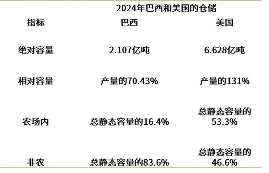 粮农组织建议一个国家的静态仓储能力应等于或超过其年度农业产量的 1.2 倍。美国仓储是产量的131%,巴西只有70%。