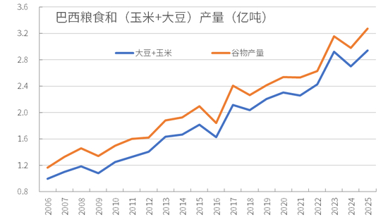 大豆和玉米是巴西主要的农作物,产量逐年扩张,2006年大豆+玉米产量共0.99亿吨,占谷物总产量1.17亿吨的85%;2025年预估大豆+玉米高达2.94亿吨,占总产量3.3亿吨的90%左右。