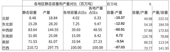 巴西各地区的静态容量和产量情况