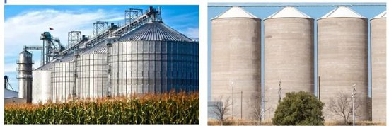 金属筒仓:由光滑或波纹钢板制成,成批生产,安装在混凝土地基上。筒仓底部可以是平底的,用于长期储存,因为其能保持谷物的完好和品质。也可以是高架的,多用于短期接收谷物,或者用于谷物的干燥。