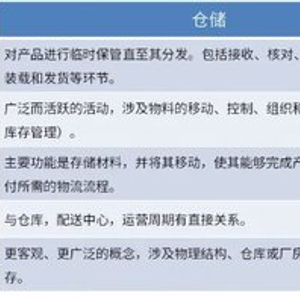 仓储:被定义为“对库存产品的临时保管,以备后续分发”,通常被用作存储的同义词。存储只是仓储流程中的一个环节,即商品暂时静态存储的阶段。