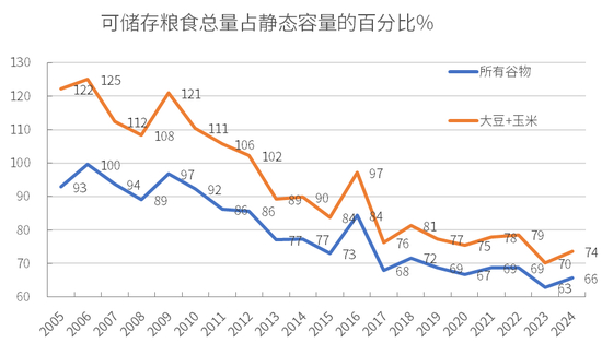 仅考虑大豆和玉米的产量,2005 年、2006年和 2009 年的静态相对仓储能力分别为122.1%、125.1%和120.9%,自 2013 年起,仓储能力显著下降,低于100.0%,到 2024 年降至 73.7%。