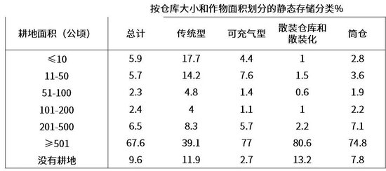 根据 2017 年农业普查的两项数据,还可以查看不同类型的仓库和不同种植面积的静态仓储能力分布情况。