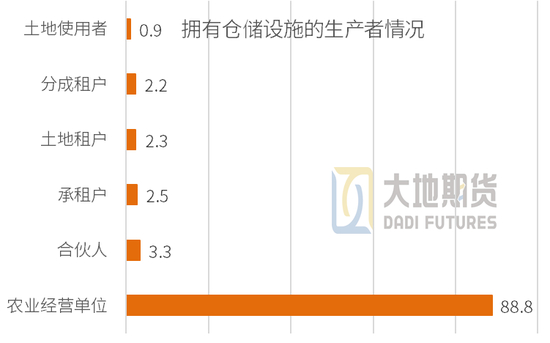 约 88.8% 的仓库属于农业经营单位所有,3.3%属于合伙人,2.5% 属于承租户或定居者,2.3% 属于土地租户,2.2% 属于分成租户,0.9% 属于土地使用者。