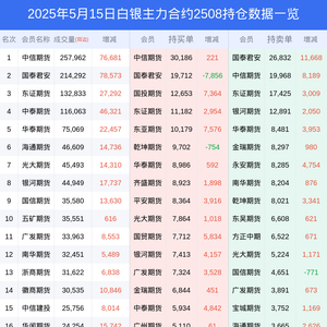 新浪期货 根据交易所数据,截至5月15日收盘主力合约白银2508,涨跌-2.34%,成交量93.60万手,持仓数据显示前20席位呈现净多,差额头寸为21657手。