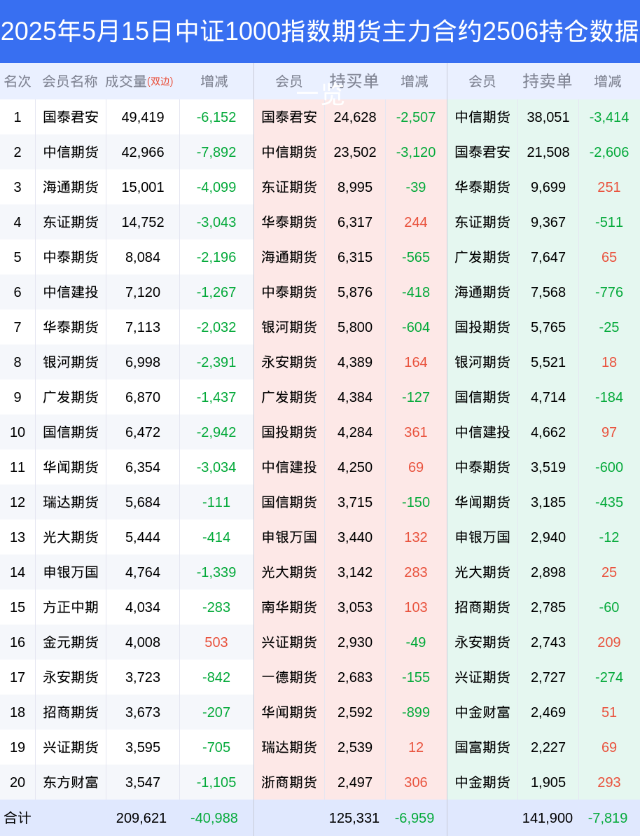 新浪期货 根据交易所数据,截至5月15日收盘主力合约中证1000指数期货2506,涨跌-1.28%,成交量15.50万手,持仓数据显示前20席位呈现净空,差额头寸为16569手。