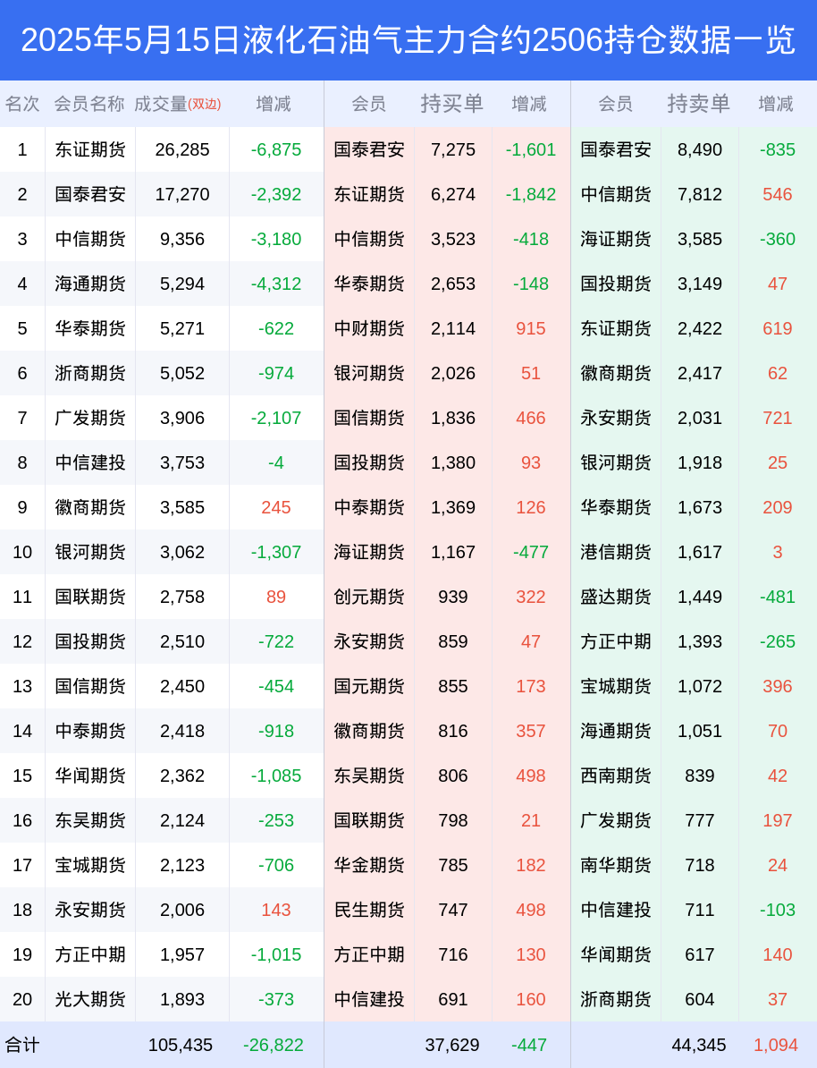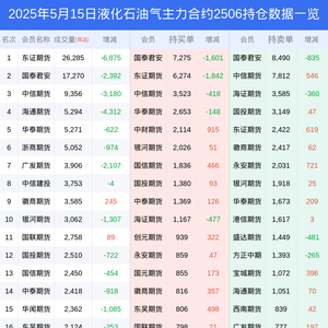 新浪期货 根据交易所数据,截至5月15日收盘主力合约液化石油气2506,涨跌-2.27%,成交量7.94万手,持仓数据显示前20席位呈现净空,差额头寸为6716手。