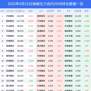 新浪期货 根据交易所数据,截至5月15日收盘主力合约烧碱2509,涨跌+2.52%,成交量62.58万手,持仓数据显示前20席位呈现净空,差额头寸为8052手。