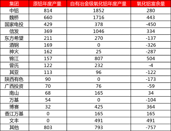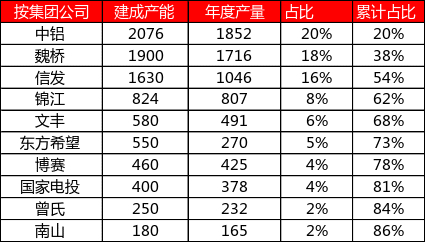 我国氧化铝企业大多隶属于几大铝业集团旗下,集中度非常高。2024年,按产量排序,前十名氧化铝企业合计产量占全国总量高达86%。其中中铝、魏桥、信发、锦江、文丰、博赛为主要的氧化铝对外销售方。规划中的氧化铝新增产能大部分为头部企业项目,未来行业集中度将继续提高。