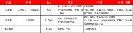 铝元素在地壳中的含量为8.3%,仅次于氧和硅,是地壳中含量最丰富的金属元素,同时也是自然界的第二大金属元素。从种类来看,铝土矿主要分为红土型、岩溶型和季赫温型三类,其中,红土型三水铝石在铝土矿中的占比高达90%,三水铝石质量高且易于开采,适用于拜耳法,在工业上广泛应用;我国主要是岩溶型铝土矿,品质不如三水铝石,国内氧化铝厂针对矿石特点创新和改进了生产方法。