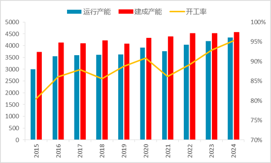 2024年,我国电解铝建成产能达到4571万吨,运行产能达到4353万吨,开工率高达95%,自2017年国内供给侧改革以来,产能天花板被限定在4500万吨左右,目前运行产能已经接近产能限制天花板,未来的产能增量被限制。