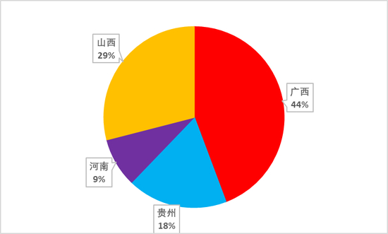 我国铝土矿资源分布高度集中。广西、河南、贵州和山西4个省(区)的储量合计占全国总储量的90%以上。其中广西壮族自治区铝土矿储量最大,贵州、河南、山西依次排列。矿石种类上,我国铝土矿主要以一水铝石为主,氧化铝含量较低,冶炼加工难度大,耗能较高。红土型铝土矿规模相对较小,主要分布在广西贵港、海南蓬莱等地;岩溶型铝土矿占90%,分布于中国西南部和中部。