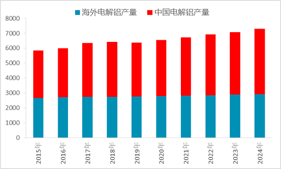根据国际铝业协会数据,2024年全球电解铝产量达到7279万吨,中国占比达到60%。近十年全球电解铝产量增长25%,中国增幅达38%,海外电解铝产量增长仅9%。