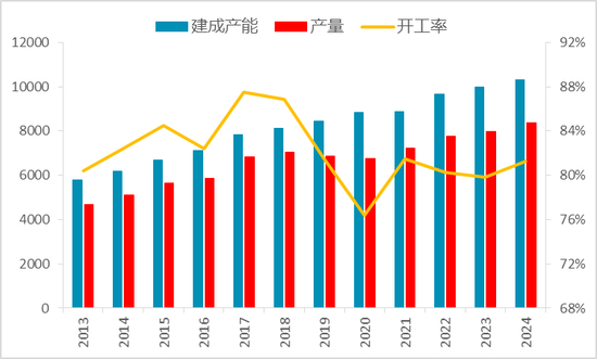 截至2024年底,我国氧化铝建成产能达到1.03亿吨,产量约8369万吨,占全球比重达到60%以上。近十年我国氧化铝产能增速高达54%,但开工率有所下滑,2024年为81%,形成了产能过剩、产量灵活调节的局面。