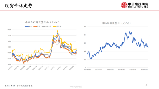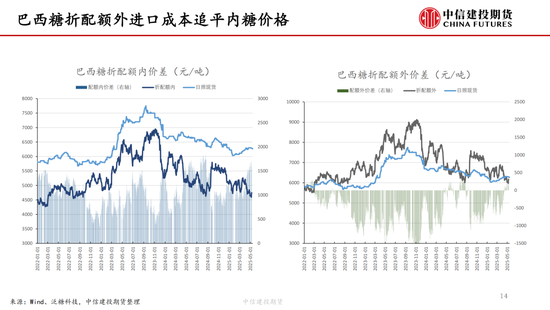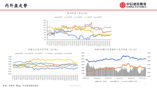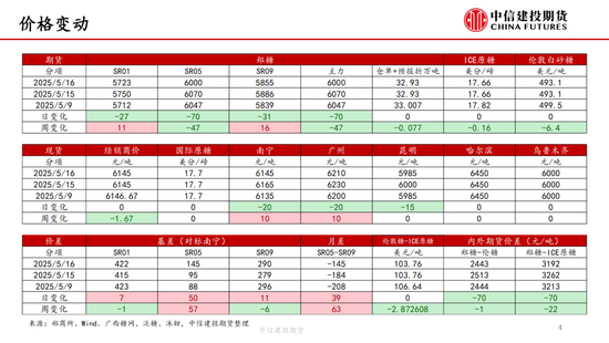 我国24/25年制糖期已接近尾声,据糖协数据,截至4月底全国累计产糖量达到1110.72万吨,较上榨季同期大幅增加115.33万吨,增幅11.59%。预计本年度食糖产量1115万吨,预计2025/26年度食糖产量1120万吨。前期糖浆预拌粉进口政策的收紧和广西干旱的扰动一度让郑糖走势偏强,内外糖价走势分化。但一方面近期广西喜迎降雨,另一方面,随着内外糖价走势的分化,配额外进口糖成本限制了郑糖价格上沿。随着配额外进口成本与内糖价格逐渐接近,内外糖价联动加强,隔夜波动有所加剧。巴西新榨季开启,首月累计产糖量158万吨,较去年同期的257.5万吨减少99.5万吨,同比降幅达38.62%,对国际糖价形成短期支撑,周内原糖主力期价一度反弹至18.29美分/磅。但巴西新榨季仍处于初期,未来变化仍然较大。据4月底Conab报告,2025/26年度巴西糖产量将达到创历史的4587万吨。另外,USDA报告显示,泰国2024/25年度食糖产量为1005万吨,较上年度增长14%,2025/26年度预计继续增产至1025万吨。因此,从中长期的视角来看,全球市场供应较为充足,这也限制了白糖的上行空间。