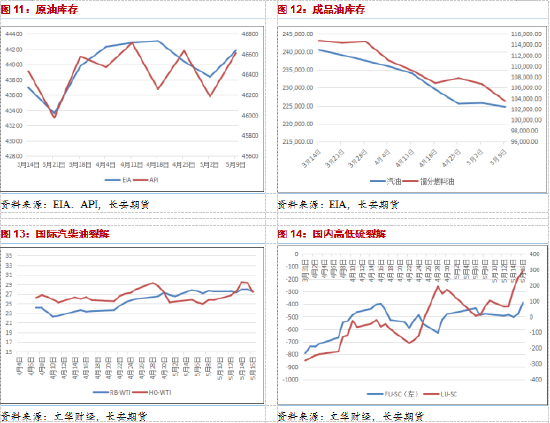 库存侧,原油方面,美国至5月9日当周API原油库存428.7万桶,预期-196万桶,前值-449.4万桶;同时5月9日当周EIA原油库存同步录得345.4万桶,预期-107.8万桶,前值-203.2万桶。本轮库存数据一转此前的连续去库走势,反而意外录得了大规模的积累,虽然这在一定程度上依然是得益于美国出口量的下降,但在北美炼厂开工水平进一步回暖且美国产量下降的当下依然对油价形成了不俗的压制力量。在成品油方面,美国至5月9日当周汽油库存则录得为-102.2万桶,预期-56.1万桶,前值18.8万桶;同时精炼油库存录得为-315.5万桶,预期12.9万桶,前值-110.7万桶。本轮成品油库存再度回归了下行走势,其中精炼油依然维持了高额的去库幅度,而汽油则不再出现小幅的积累,这在一定程度上展现出北美汽油消费的客观韧性,同时这也将导致后续汽油的价格强势程度得以维持,进而导致低硫裂解得到一定程度的支撑。