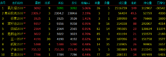 2025年5月19日,早盘收盘,国内期货主力合约跌多涨少。氧化铝涨超5%,集运欧线涨超2%,沥青涨超1%;跌幅方面,焦煤、纯碱、焦炭、碳酸锂跌超2%,工业硅、尿素、甲醇、硅铁、热卷、铁矿石跌超1%。
