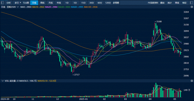豆粕节前连续走弱,主要受到了南美丰产与到港压力的影响。据机构数据显示,五一假期期间,豆粕现货价格大幅下挫200元/吨;而近半个月以来,沿海地区43%蛋白豆粕价格一周内从3800元/吨左右跌至不足3100元/吨,跌幅近700元/吨,创年内最大单周跌幅。