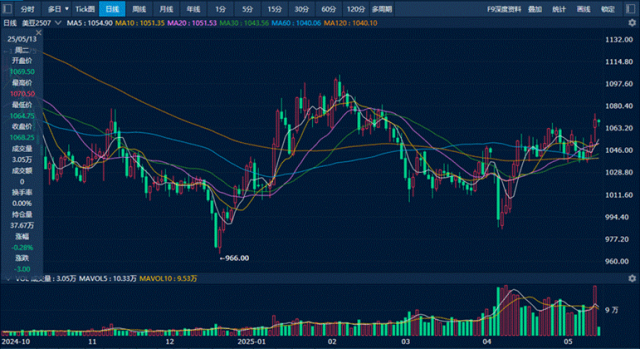 当地时间5月12日上午9:00,双方发布《中美日内瓦经贸会谈联合声明》,大幅降低双边关税水平。这一消息缓解了市场对新作美豆出口的担忧,需求端存在向好预期使得CBOT大豆及相关品种普遍反弹。