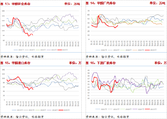 库存方面,甲醇库存较低,其中港口因伊朗装置今年恢复缓慢,库存水平大幅低于往年同期,故甲醇现货价格偏强,上周港口甲醇到港量23.35万吨,显性抵港量较少,且节后下游补库,港口库存再度回落,5月16日当周,甲醇厂家库存48.39万吨,环比减少7.8万吨,低于上年同期7.48万吨,本周计划到港量增加,港口库存或止跌回升。