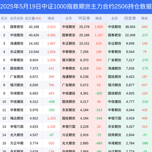 新浪期货 根据交易所数据,截至5月19日收盘主力合约中证1000指数期货2506,涨跌+0.45%,成交量14.10万手,持仓数据显示前20席位呈现净空,差额头寸为14839手。