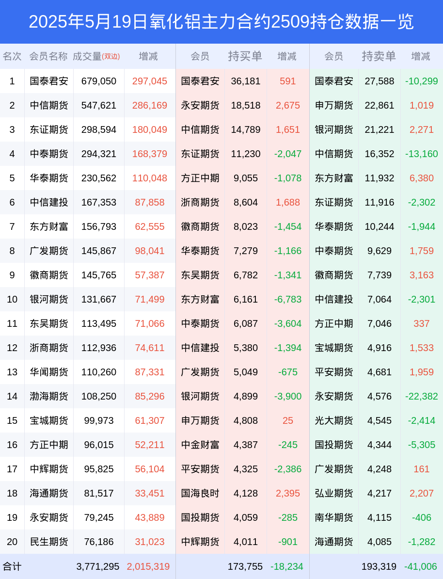 新浪期货 根据交易所数据,截至5月19日收盘主力合约氧化铝2509,涨跌+6.25%,成交量288.65万手,持仓数据显示前20席位呈现净空,差额头寸为19564手。