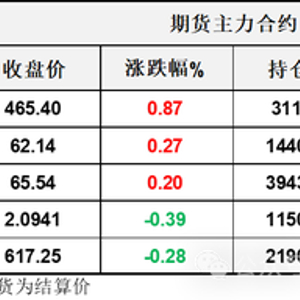 【1】WTI主力原油期货收涨0.17美元,涨幅0.27%,报62.14美元/桶;布伦特主力原油期货收涨0.13美元,涨幅0.2%,报65.54美元/桶;INE原油期货收涨0.87%,报465.4元。