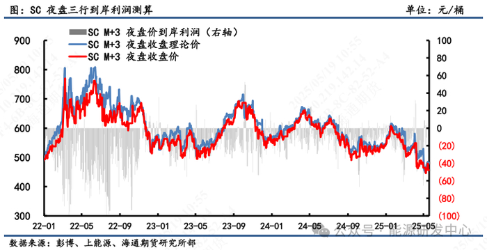2)套利:①估值:5月6日凌晨2:30,Brent 2507盘面价为64.56美元/桶,SC 2508盘面价为456.1元/桶,测算SC 2508盘面理论价为476.2元/桶,盘面估值偏离程度-4.23%。②利润:测算SC2508盘面到岸利润-20.13元/桶,折合-2.79美元/桶。③价差:SC2508-Brent2507盘面差为-1.31美元/桶,理论差1.49美元/桶,盘面价差低于理论价差。(注:本周Brent首行为2507;SC首行为2507;其中M代表时下5月)