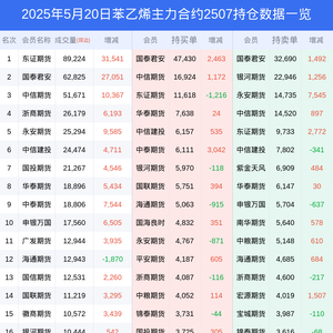 新浪期货 根据交易所数据,截至5月20日收盘主力合约苯乙烯2507,涨跌-1.92%,成交量34.29万手,持仓数据显示前20席位呈现净空,差额头寸为8725手。